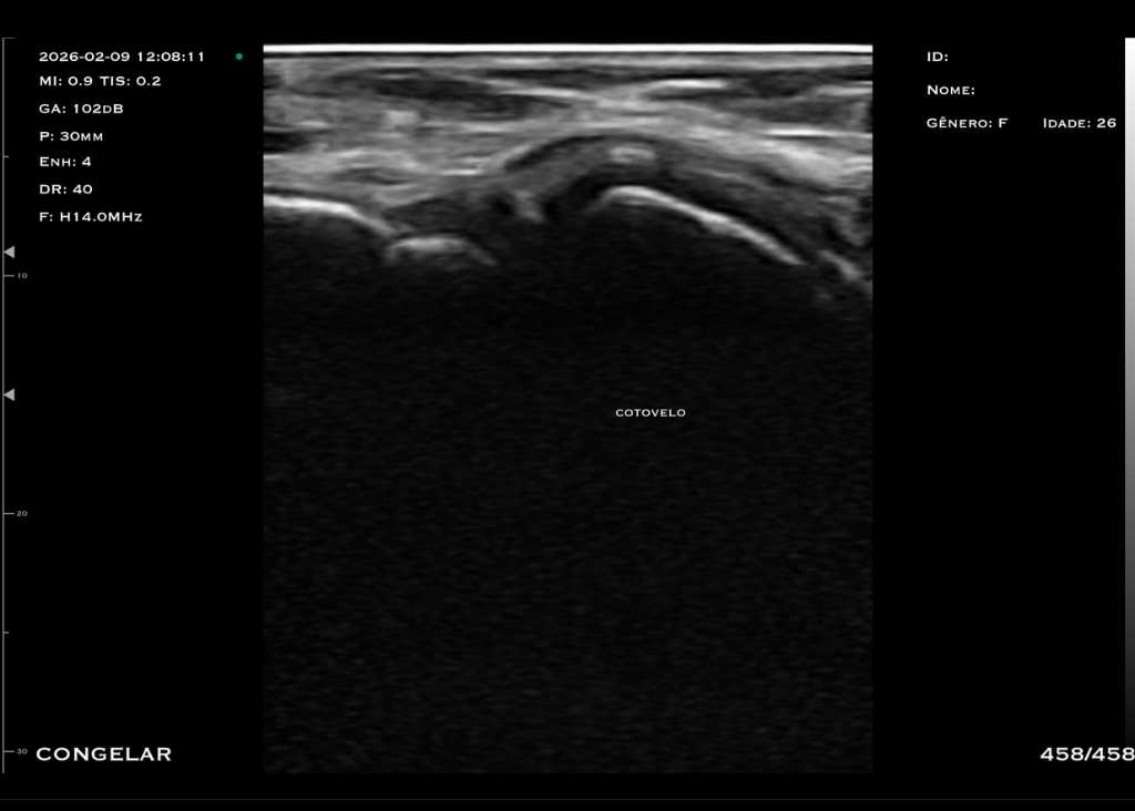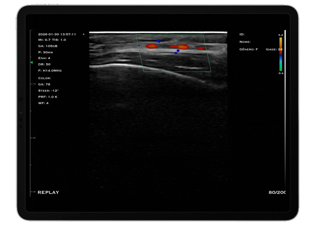 O trasdutor linear oferece imagens nítidas e detalhadas, permitindo a visualização precisa de estruturas como pele, tecido subcutâneo, músculos, tendões e articulações. A alta frequência garante excelente resolução para exames que exigem detalhamento extremo.